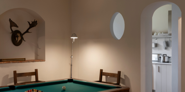 Farm-style furnishing with white-washed walls welcome you into the lovely billiard lounge, a few steps from a small, comfortable kitchenette. The stairway leads to the top floor where you will find two large bedrooms, each with its own private bathroom.