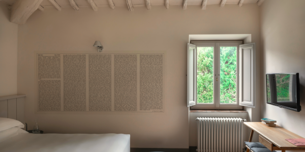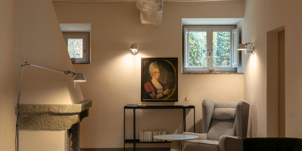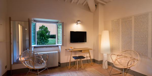 A simple, linear garden surrounded by apple and poplar trees, tall bay leaf, holm oaks and linden trees. A beautiful green field surrounds the stone farmhouses and leads to the pool that is surrounded by a solarium where you can completely relax and soak up the sun.