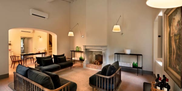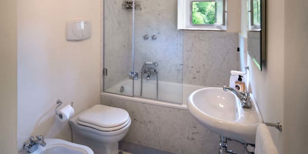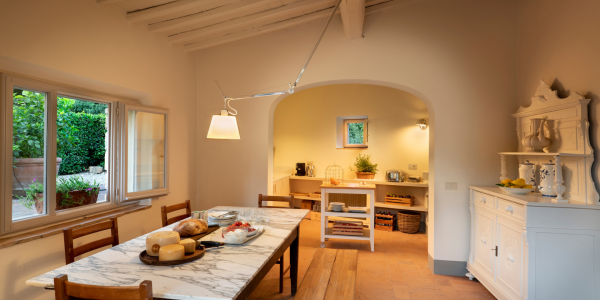 A beautiful set of arched glass doors invites you into the high ceilinged lounge, with comfy Tuscan furniture. Next to the fully equipped kitchen, the dining room looks out onto the garden. The laundry and bathroom are on the ground floor, while on the top floor there are two bedrooms, each with its own bathroom. A covered outdoors dining table seats 22 guests for memorable alfresco parties.