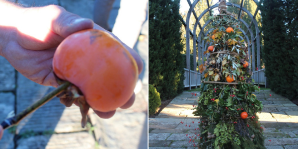 5. But there was still something missing… the Christmas decorations! We chose to use a typical autumn fruit, the persimmon. To hold the fruit firmly in place on the tree, we pushed the top end of a stick into the fruit and then plunged the other, longer end of the stick firmly into the tree. And there is your home-made Christmas tree, all ready to decorate your garden!