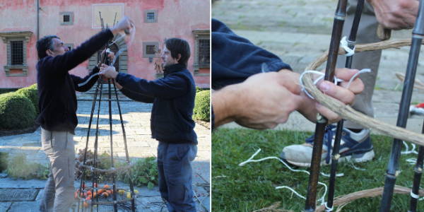 1. First, we built a basic structure for the tree. Then we stood the bamboo canes upright in a circle and supported them by using string or twine to tie the base of each cane to a flexible clematis branch.
