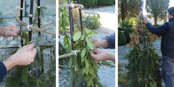 3. Once the basic structure of the tree was ready, we used raffia to tie leaves and branches to the tree. We started with pine at the base, followed by cypress, ivy, olive, rosehip, holm oak leaves and twigs, and anything else we could find. It is important to tie the branches tightly to the structure, so that it holds nicely together.