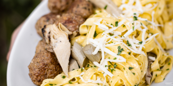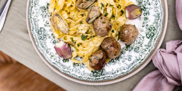 Tagliatelle with boar meatballs, oil preserved artichokes, lemon zest and shavings of pecorino di Pienza.