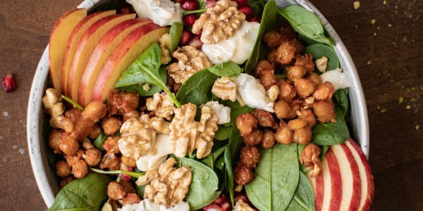 Chickpea salad with baby spinach, pomegranate, apple, gorgonzola and walnuts
