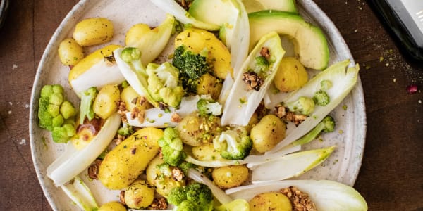 Broccoli, butter potato, endive, avocado, granola and chopped pistachio salad