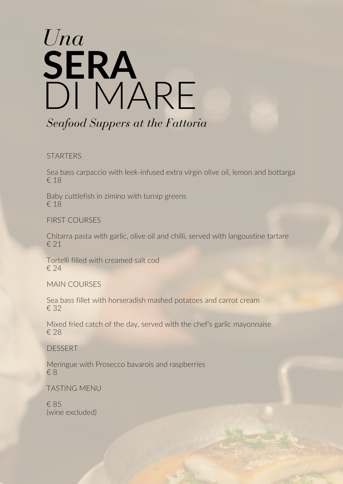 An encounter between farm cuisine and the sea of Tuscany, where the quality of the ingredients takes center stage. The Seafood Dinners at Vignamaggio are born from a culinary collaboration between our chefs and the finest certified suppliers along the Tuscan coast, with the utmost respect for seasonality and the sea.