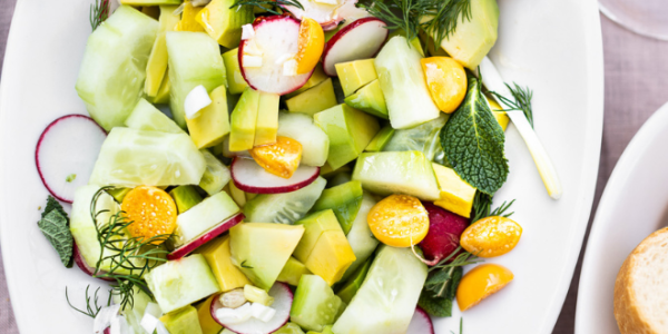 INSALATA DI AVOCADO, CETRIOLI, RAVANELLI E BACCHE DI ALCHECHENGI