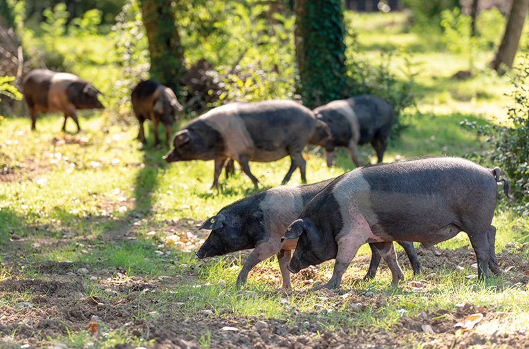 Tra le radure pianeggianti di Montagliari, sulla strada sterrata che conduce al fiume, non potrete fare a meno di vedere qualche maialino che riposa al sole o scorrazza tra il bosco e il pascolo. I suini di Cinta Senese allevati nella tenuta hanno 70 ettari di foreste a loro completa disposizione, fanno il bagno, dormono nel soffice fieno della loro stalla o corrono nel bosco alla ricerca di ghiande.
