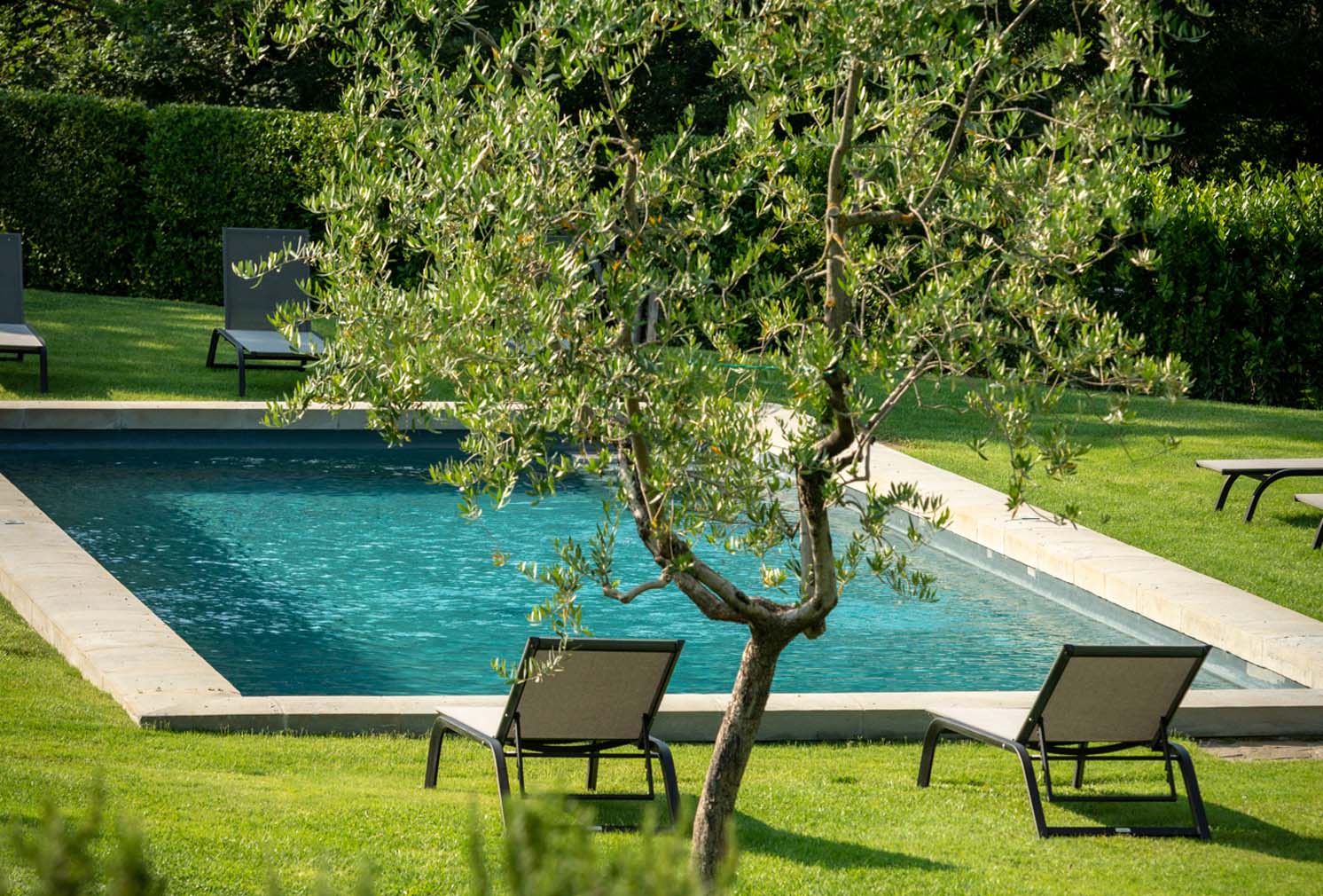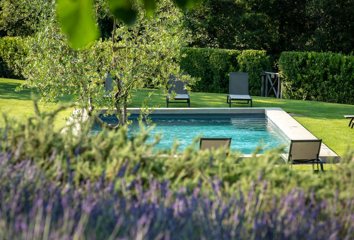 The Prato garden is picturesque – soft green fields, large oak trees, fig trees, small apple trees, olive trees, thriving rosemary bushes and corners brimming with lavender. The three stone dwellings are joined by a stone path leading to the swimming area, which is equipped with comfortable loungers for sunbathing. A few steps from the pool is a fully equipped gym with showers and a Turkish bath.