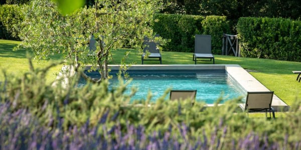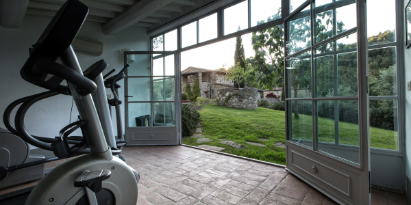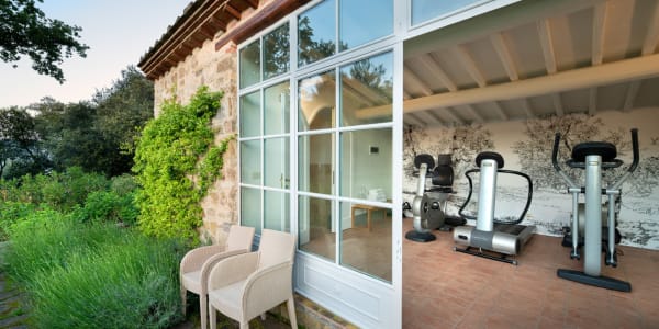 The Prato garden is picturesque – soft green fields, large oak trees, fig trees, small apple trees, olive trees, thriving rosemary bushes and corners brimming with lavender. The three stone dwellings are joined by a stone path leading to the swimming area, which is equipped with comfortable loungers for sunbathing. A few steps from the pool is a fully equipped gym with showers and a Turkish bath.