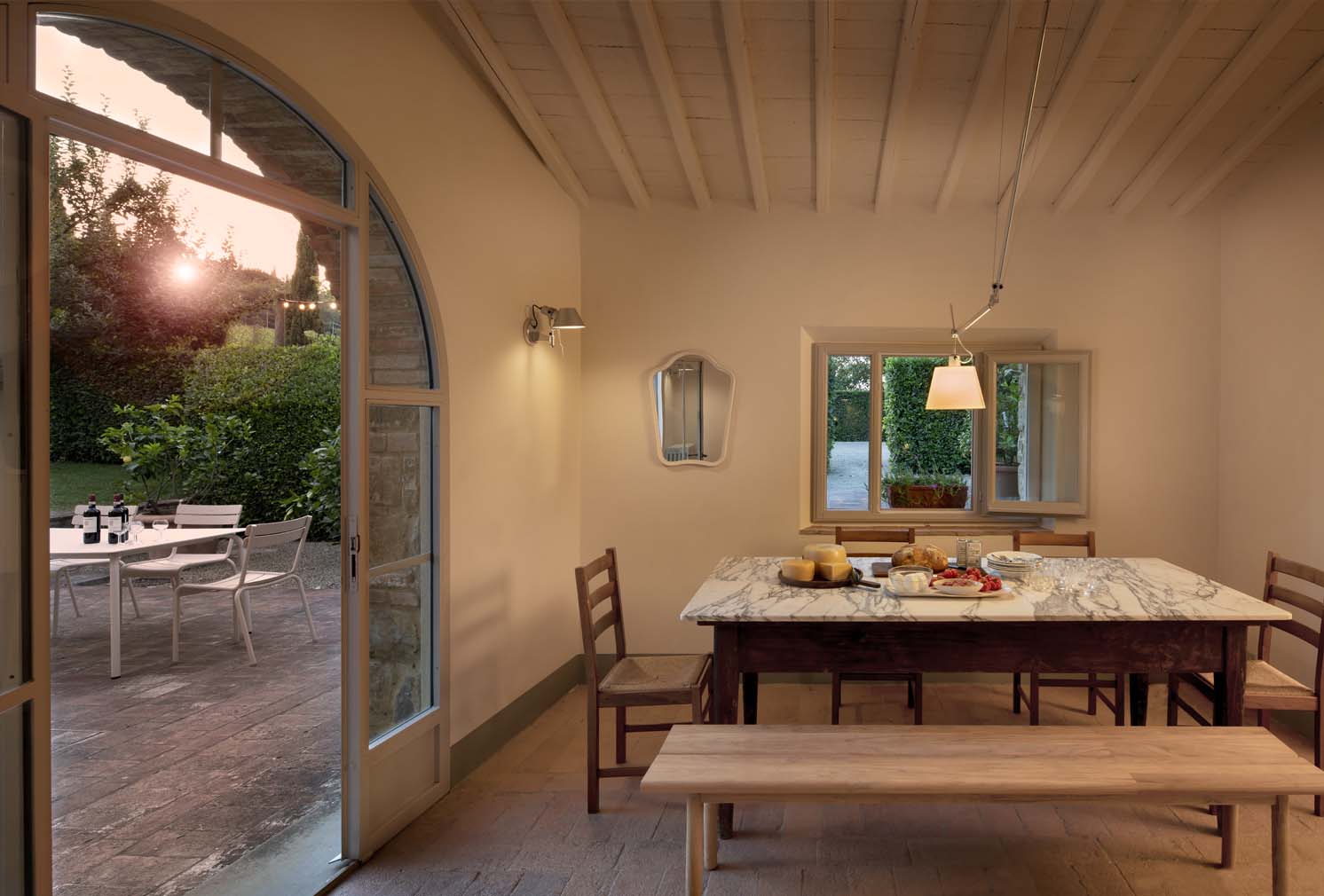 The barn's large dining room and living room can accommodate the whole family, where a beautiful set of arched glass doors invites you into the high ceilinged lounge, with comfy Tuscan furniture. On warm sunny days, you can enjoy the garden, cooled by the river that flows past.