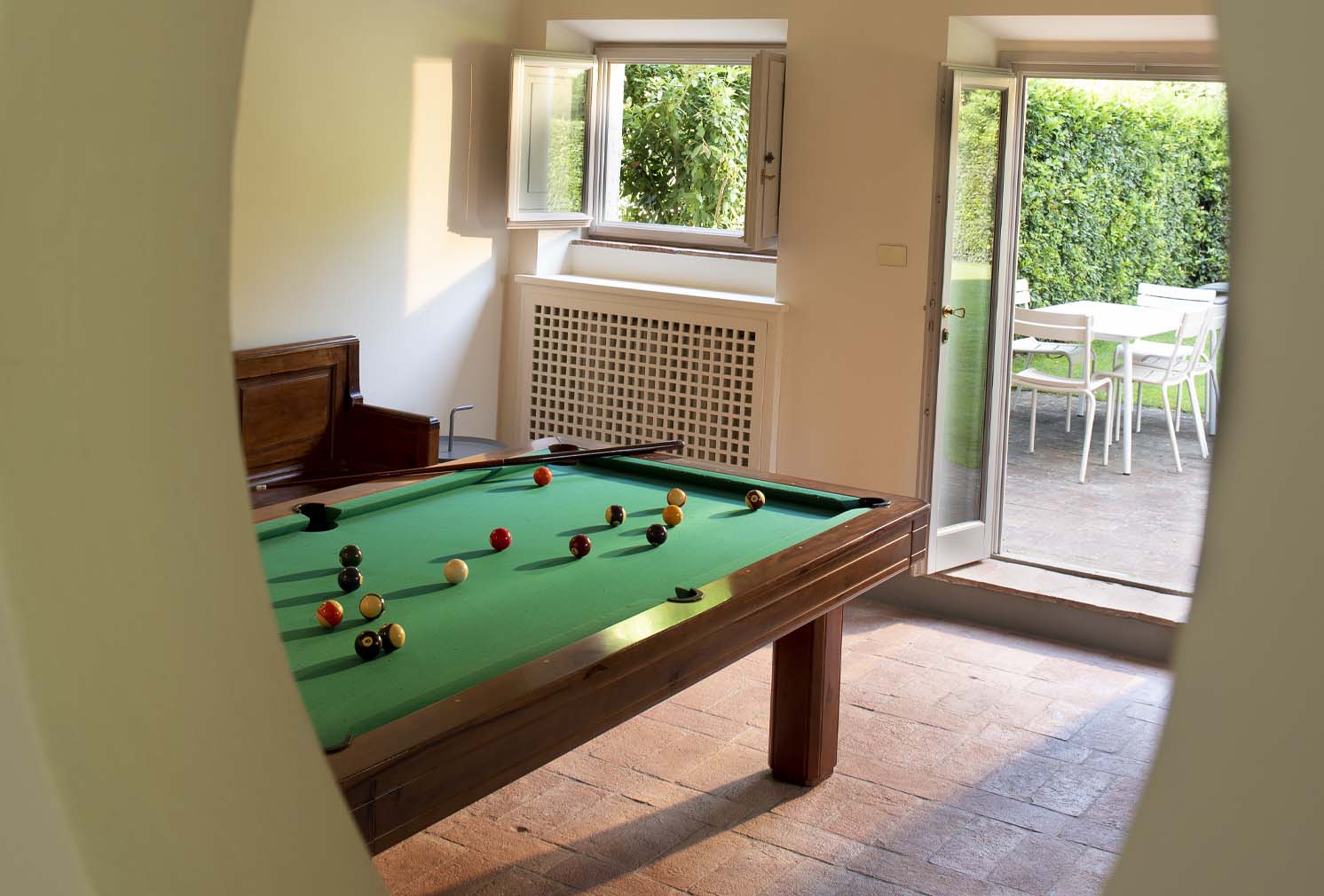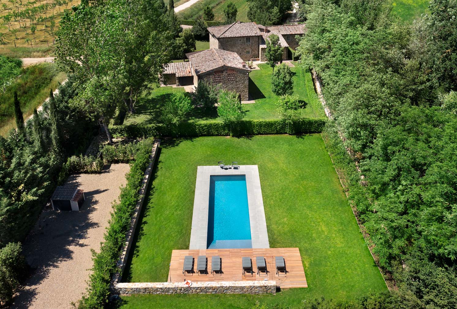 A simple, linear garden surrounded by apple and poplar trees, tall bay leaf, holm oaks and linden trees. A beautiful green field surrounds the stone farmhouses and leads to the pool that is surrounded by a solarium where you can completely relax and soak up the sun.