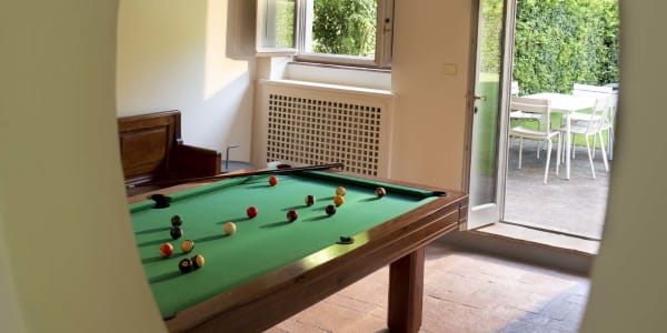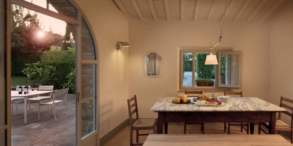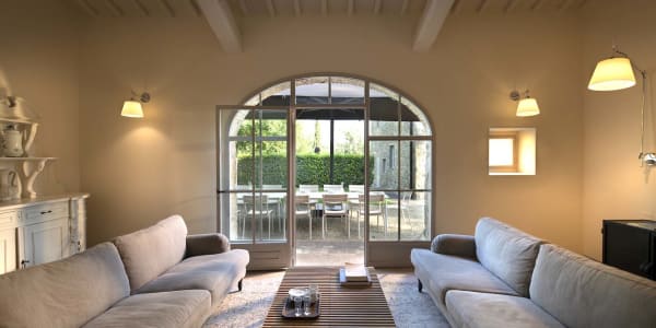 The barn's large dining room and living room can accommodate the whole family, where a beautiful set of arched glass doors invites you into the high ceilinged lounge, with comfy Tuscan furniture. On warm sunny days, you can enjoy the garden, cooled by the river that flows past.